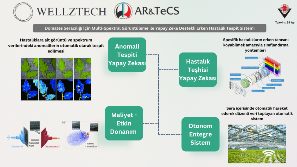 Topraksız tarım domates yetiştiriciliğinde hızla yayılan, erken evrede çıplak gözle teşhis edilemeyen hastalıklar ciddi zararlara yol açmaktadır. Bu hastalıkların erken teşhisi için yapay sinir ağlarına dayalı bir ürünün sektöre yüksek katma değer sağlayacağı öngörülmektedir. Proje kapsamında, yüksek teknoloji kullanan, topraksız tarım yapan domates seraları için, derin öğrenme modelleri kullanarak erken anomali tespit ve uyarı sistemi geliştirilecektir. Hyperspectral kamera kullanılarak geliştirilecek yapay zekâ programı ile hastalıklar erken teşhis edilecektir. Akabinde Hyperspectral kameradan toplanan bilgiler ışığında daha uygun bütçeli sensörler geliştirilerek ürün maliyeti azaltılacaktır. Ürün halihazırda kullanılan kültür işlem arabalarıyla uyumlu ve otonom olacak şekilde kullanıma sunulacaktır. Bu sayede hastalıklar yüzünden senelik %30 civarı olan kayıplar engellenecek, üretici mali kayıpları azaltılacak, ilaç kullanımı azaltılarak, yeşil dönüşüme katkı sağlanacak ve ürün kalitesi arttırılacaktır. Proje kapsamında ürettirilecek sensörler ile, görünür bölge dışı hastalık belirtileri de yakalanarak erken uyarı sağlanacak, pahalı cihazlar yerine maliyet etkin çözümler sera sektörüne sunulacaktır.